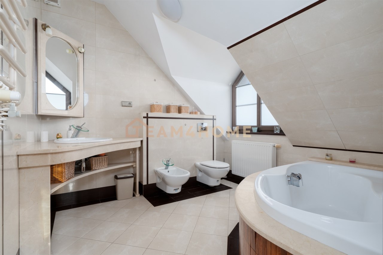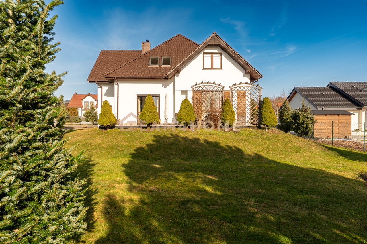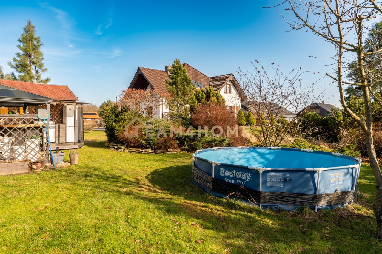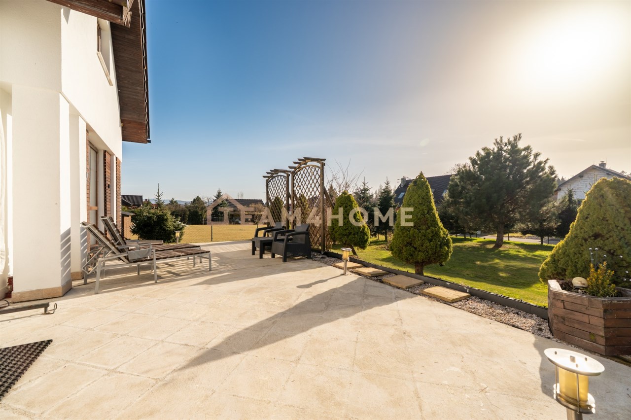 Nieruchomość usytuowana jest na dużej, nasłonecznionej i bardzo intymnej działce o powierzchni 1750 m². Liczne nasadzenia zapewniają prywatność oraz naturalne odgrodzenie od sąsiadów. Teren jest w całości ogrodzony. Do dyspozycji właścicieli pozostaje podjazd wyłożony kostką brukową, garaż dwustanowiskowy z automatyczną bramą, kuchnia zimowa, zewnętrzna kuchnia letnia oraz wydzielona strefa przygotowana pod basen i relaks. Na posesji znajduje się również studnia umożliwiająca podlewanie ogrodu oraz mycie samochodów.