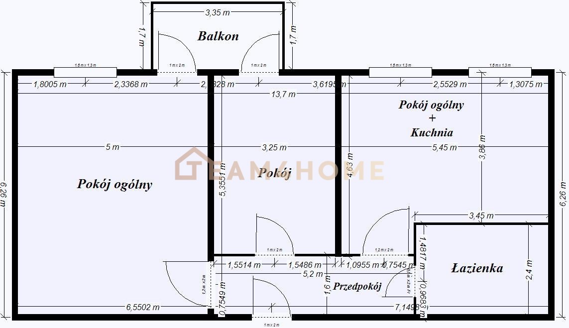 Mieszkanie znajduje się na drugim piętrze i składa się z dwóch przestronnych pokoi, z których każdy posiada wyjście na balkon, kuchni z jadalnią, przedpokoju oraz łazienki. Kluczowym atutem nieruchomości jest fakt, że wszystkie ściany wewnętrzne mają charakter działowy. Daje to możliwość całkowitej zmiany układu pomieszczeń i swobodnej aranżacji wnętrza, w tym wydzielenia większej liczby pomieszczeń.